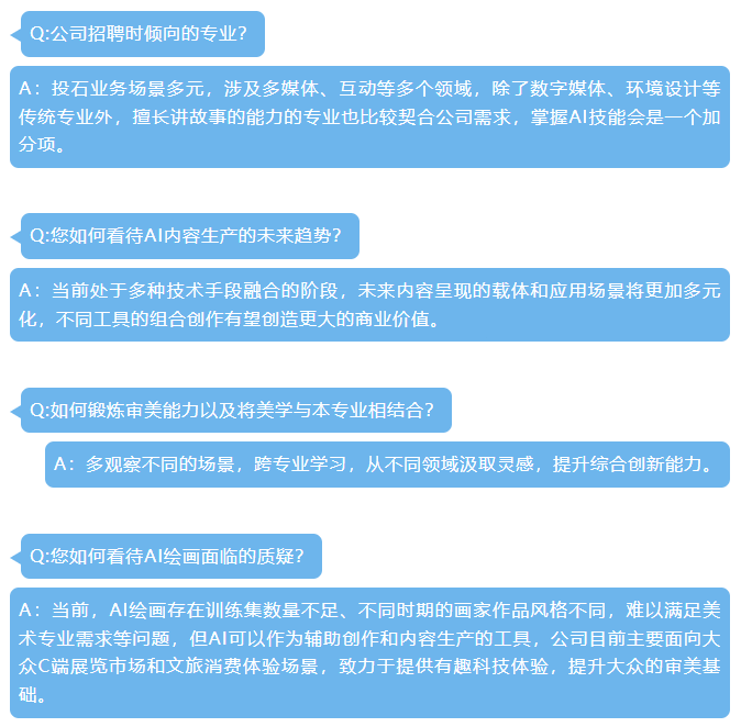 此外,投石智能詳細介紹了公司在文旅夜游、燈光展覽、人工智能美育等領域的業(yè)務。公司在山西大同打造的城墻投影秀令人印象深刻,該項目將大同城墻進行投影顯示,結合城市在地文化,并融入新媒體數(shù)字藝術的視覺呈現(xiàn),舉辦了全球數(shù)字光影藝術展,吸引了來自28個國家的102位作者參與比賽和展演。在與公司董事長孫峰峰的問答環(huán)節(jié)中,同學們積極提問,現(xiàn)場氣氛熱烈。