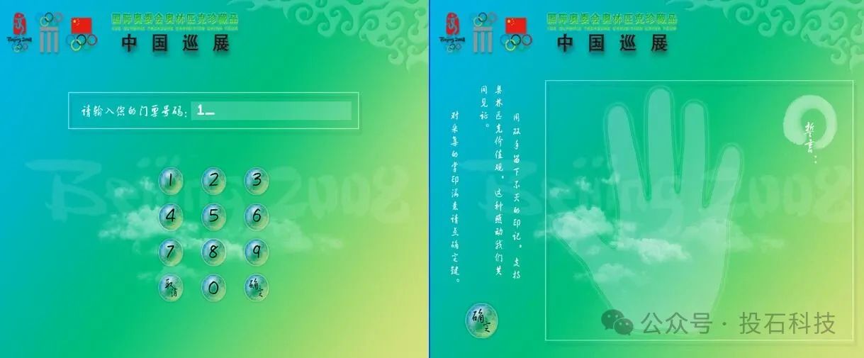 北京奧運會期間,海內(nèi)外無數(shù)游客被吸引到北京,他們幾乎都想為自己的北京奧運之行留下些什么??吹饺绱司蘖康男枨?,投石科技的技術(shù)團隊琢磨出了一個把觀眾的掌印和北京奧運會標(biāo)志打印在一張紀(jì)念卡上的裝置。