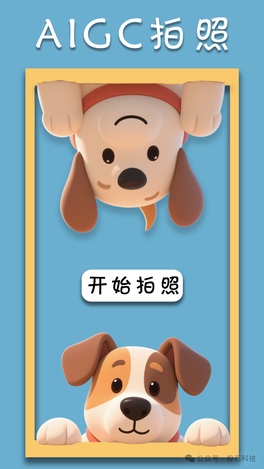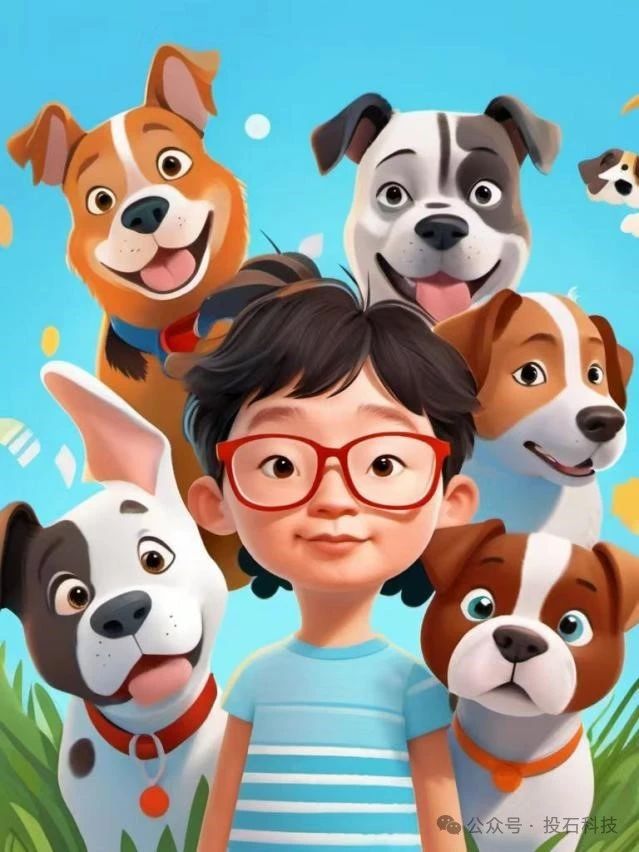 在本案例中,投石訓(xùn)練了能夠捕捉被拍照者面部特征、衣物特征等特定元素的AI繪畫模型,對用戶拍照后,可生成定制化的卡通風(fēng)格圖片,背景為可愛的小狗。