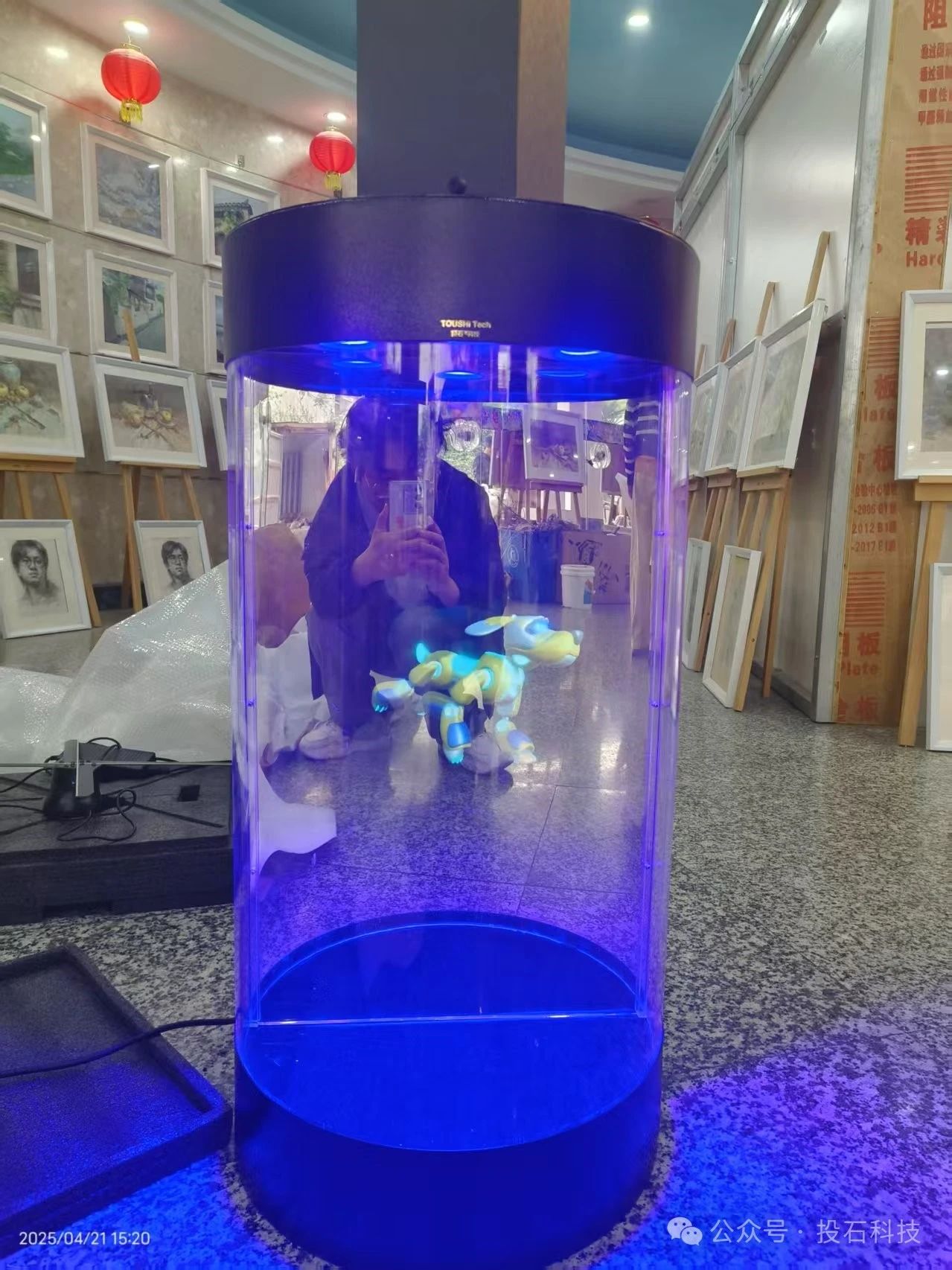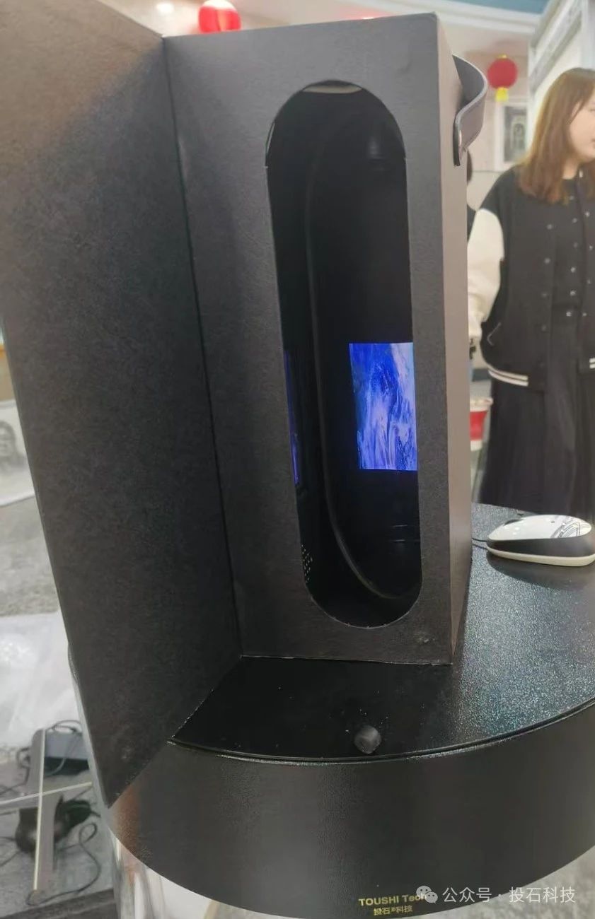 全息倉(全息機(jī)器狗)是一款裸眼3D終端顯示設(shè)備。該設(shè)備是利用鏡面反射原理,對于2d影像進(jìn)行分層透視處理,結(jié)合空間的縱深感,通過特質(zhì)顯示屏技術(shù)將虛擬內(nèi)容與真實(shí)場景進(jìn)行疊加,無需借助眼鏡設(shè)備實(shí)現(xiàn)裸眼 3D 視覺效果。此次展品采用視頻形式播放全息影像,后續(xù)還可集成攝像頭、聲音采集裝置等傳感器實(shí)時(shí)捕捉用戶圖像及聲音,結(jié)合觸覺反饋系統(tǒng)增強(qiáng)人機(jī)交互真實(shí)感。