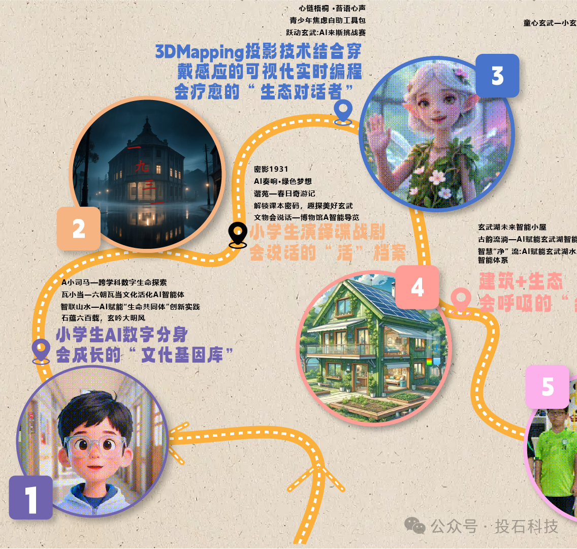 利用3dmapping技術(shù)創(chuàng)造立體視覺,結(jié)合穿戴設(shè)備,形成生理數(shù)據(jù)與自然反饋的情緒疏導閉環(huán)。結(jié)合地域文化,以玄武“梧桐大道-美齡宮”為交互媒介,實現(xiàn)苔蘚生態(tài)與AI的互動??鐚W科設(shè)計,通過分層任務適配不同學段,建立科學、技術(shù)、藝術(shù)與心理干預的綜合體系。