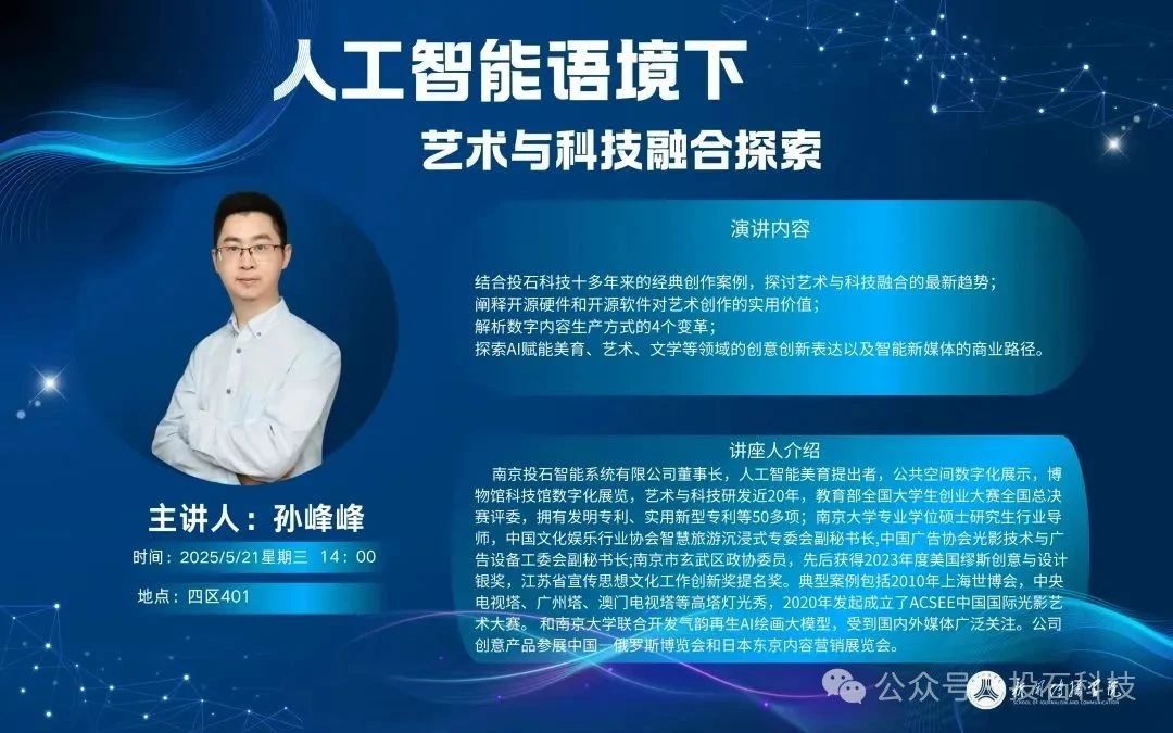 2025年4月下旬至5月,南京投石智能系統(tǒng)有限公司董事長(zhǎng)孫峰峰先后受邀赴南京師范大學(xué)泰州學(xué)院、南京航空航天大學(xué)金城學(xué)院藝術(shù)與傳媒學(xué)院、南京理工大學(xué)設(shè)計(jì)藝術(shù)與傳媒學(xué)院與南京傳媒學(xué)院新聞傳播學(xué)院做主題為“人工智能語(yǔ)境下的藝術(shù)與科技融合探索”的專題講座,并對(duì)學(xué)生作品進(jìn)行技術(shù)指導(dǎo)。
