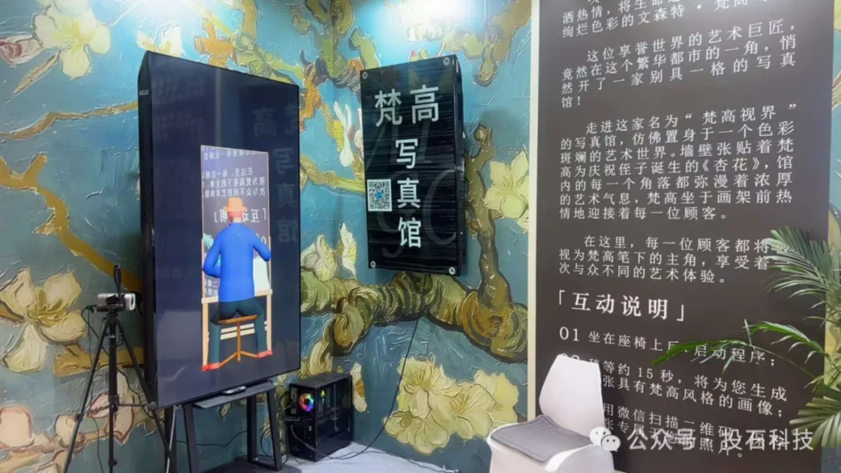 梵高寫真館讓觀者站在一臺充滿魔力的機器前,只需片刻凝視,15秒后,一幅融合了你的面容與梵高獨特風(fēng)格的肖像畫便躍然“屏”上。這不是夢,而是“梵高寫真館”帶給每一位參觀者的奇幻體驗。AI技術(shù)在這里化身為神奇的畫筆,讓梵高的熱情與色彩穿越時空,與現(xiàn)代人的面容交織,創(chuàng)造出獨一無二的藝術(shù)佳作。