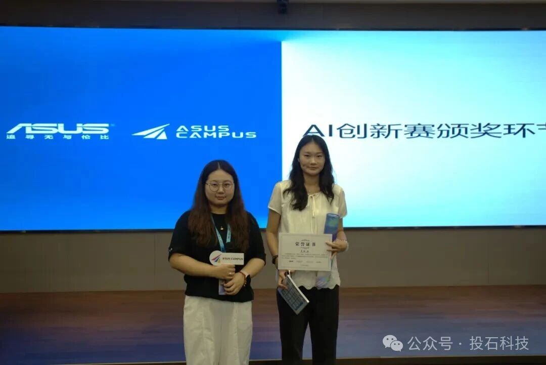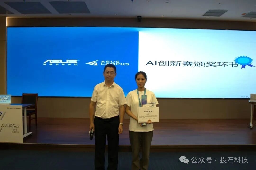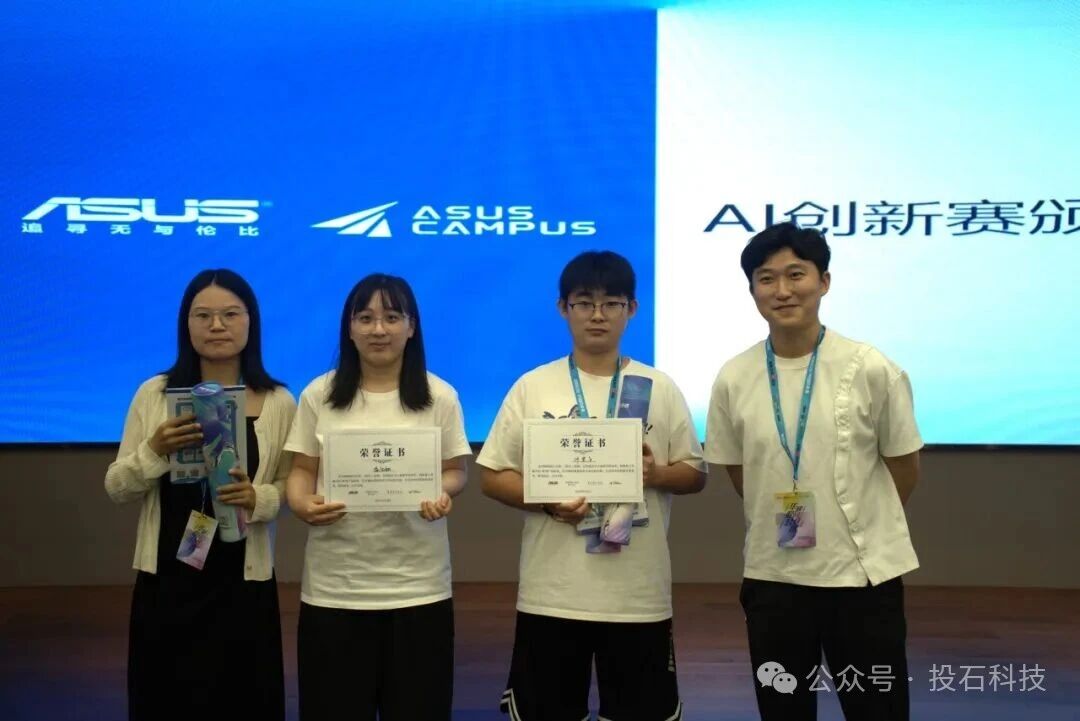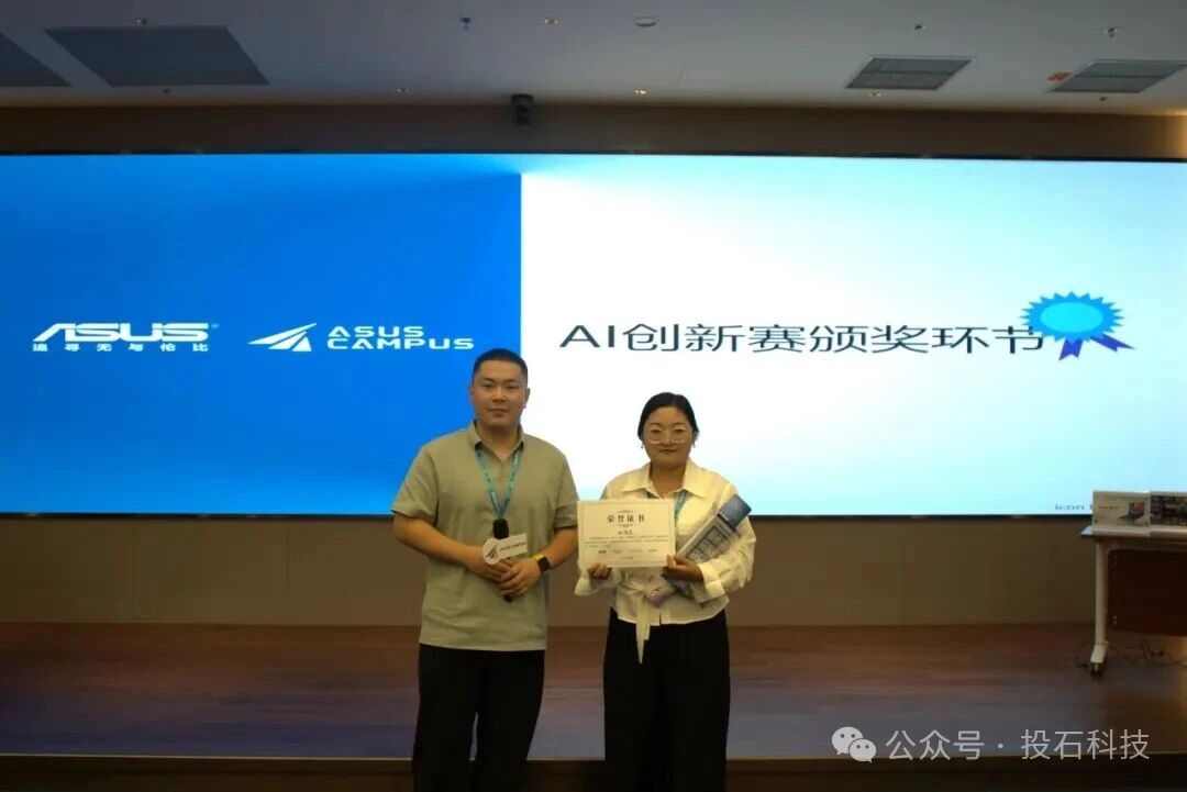 AI創(chuàng)新賽后,投石智能董事長孫峰峰、南通理工學(xué)院教師代表、華碩電腦產(chǎn)品經(jīng)理代表向優(yōu)秀學(xué)員頒發(fā)了活動證書與活動獎品。