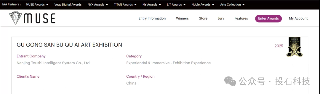 近日,2025年繆斯設(shè)計獎 MUSE Design Awards公布了獲獎名單。由南京投石智能系統(tǒng)有限公司主辦的《故宮三部曲》人工智能藝術(shù)大展榮獲展覽體驗類別——沉浸式體驗類獎項金獎!