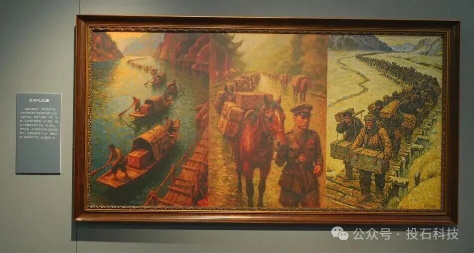 孫峰峰對《溥儀出宮》與《文物遷徙圖》尤為自豪。前者還原了無歷史照片留存的場景,完成了藝術上的“虛擬創(chuàng)新”;后者則用三幅油畫拼接,將國寶西遷“山路、水路、陸路并行”的艱辛具象化,不少觀眾駐足良久,仿佛能觸摸到那段歲月的厚重。