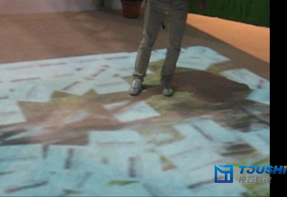 投石互動(dòng)為2011年亞洲戶外用品展邊城體育互動(dòng)體驗(yàn)區(qū)提供的互動(dòng)地面投影,墻面互動(dòng)投影等新穎、低碳的高科技體驗(yàn)產(chǎn)品,當(dāng)頂部紅外感應(yīng)攝像機(jī)感應(yīng)到區(qū)域內(nèi)有人走入投影到地面上的畫面時(shí),畫面發(fā)生動(dòng)態(tài)變化。通過(guò)影像動(dòng)作識(shí)別,機(jī)器視覺(jué)等技術(shù),結(jié)合全新的創(chuàng)意表現(xiàn)形式,提供了多達(dá)數(shù)十種動(dòng)態(tài)絢麗的互動(dòng)效果。而墻面互動(dòng)投影系統(tǒng),則當(dāng)觀眾用手對(duì)著墻面凌空揮動(dòng)后,即可切換播放不同的視頻。