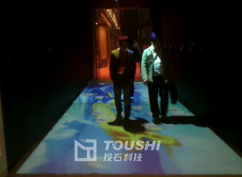 2012年4月,南京投石智能系統(tǒng)有限公司為于2012年4月6日在南京國際博覽中心舉行的聯(lián)想2012年經(jīng)銷商大會(huì)提供2通道地面互動(dòng)投影服務(wù)。本展示區(qū)域用于展示聯(lián)想公司的LOGO以及筆記本、PAD等電子產(chǎn)品,當(dāng)頂部紅外感應(yīng)攝像機(jī)感應(yīng)到區(qū)域內(nèi)有人走入投影到地面上的畫面時(shí),畫面效果發(fā)生變化,人離開后,虛擬的投影畫面恢復(fù)初始動(dòng)態(tài)效果。